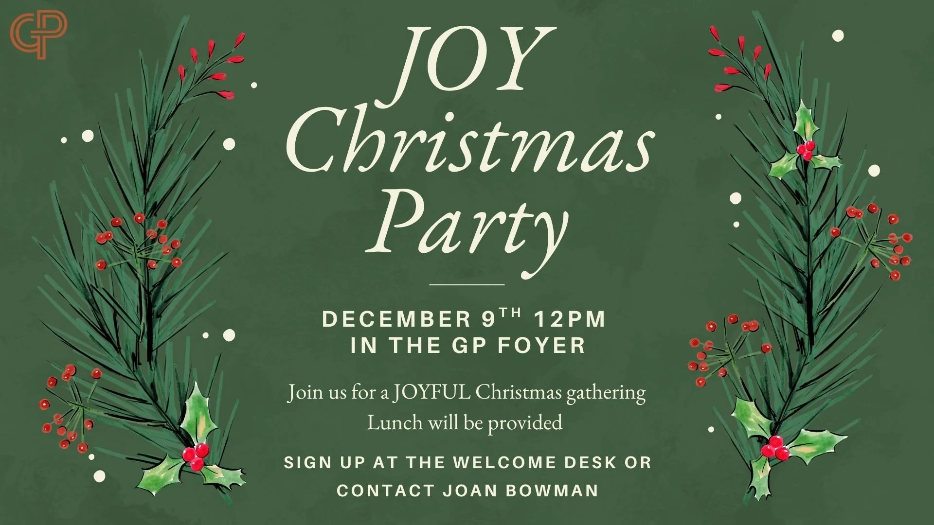 Trip to Bird-In-Hand, PA. 9am departure from GP. Travel by church vans and vehicles. Lunch & a Christmas show included. Return home the same evening. Cost is $69. Sign up at Welcome Desk or contact Joan Bowman.